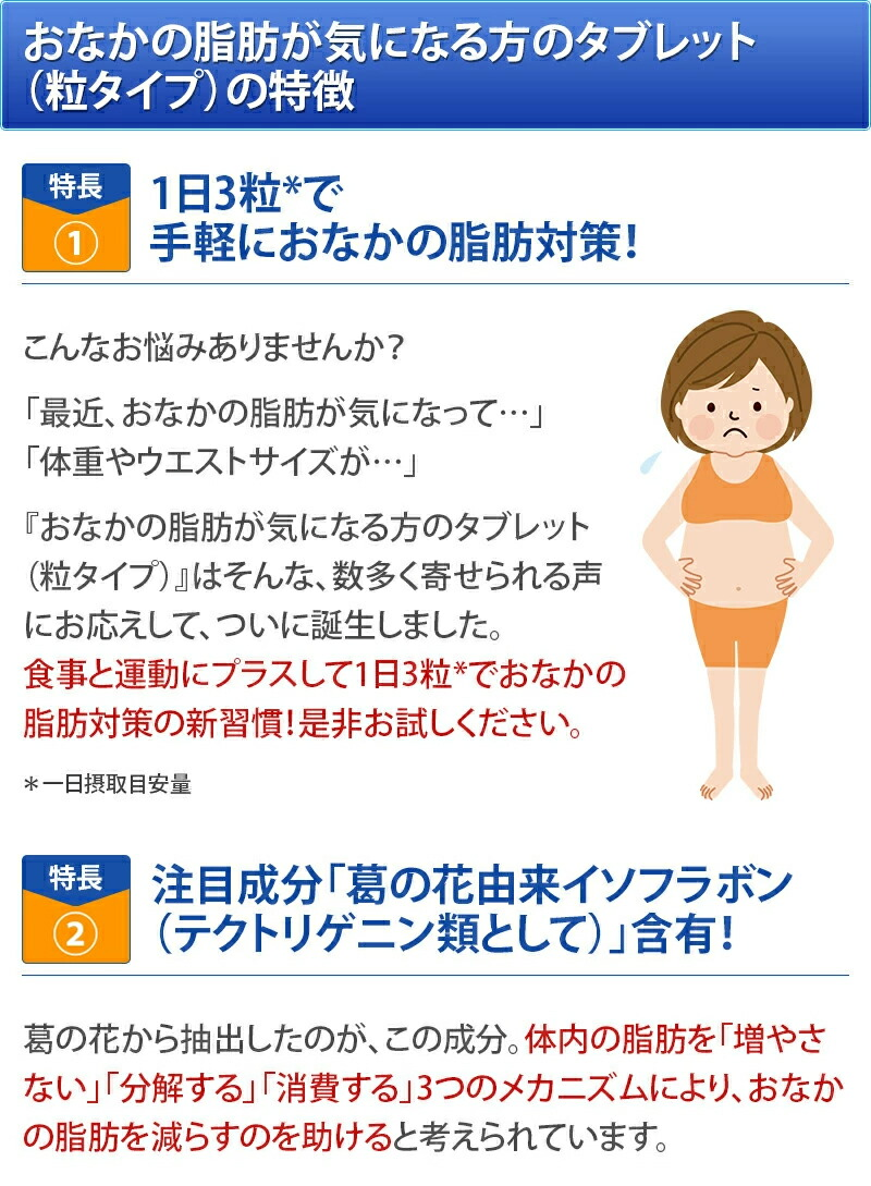 お腹の脂肪が気になる方に向けた錠剤です。加齢で脂肪が落ちにくく、体重の変化に敏感な方におすすめ。お腹の脂肪を減らす健康食品です。